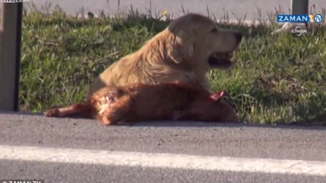 Thấy bạn bị xe đâm, chú chó không bỏ đi mà ở lại, đi quanh để bảo vệ rồi kéo xác bạn vào vệ đường.