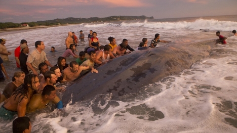 Một chú cá voi khổng lồ dài 18m không may bị mắc cạn trên vùng biển Popoyo, Nicaragua. Hơn 50 người tham gia cứu hộ bao gồm người dân địa phương và du khách đã nỗ lực để giải cứu chú cá voi tội nghiệp này.