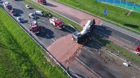 Người tham gia giao thông tại cao tốc A2 nối liền Wrzesnia và Slupca, Ba Lan đã được chứng kiến một khung cảnh kỳ lạ vào hôm 9/5 vừa qua khi 12 tấn... sữa chocolate trào ra đường.