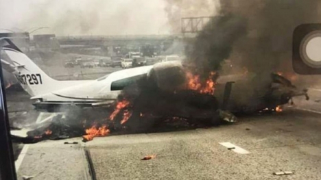 Một máy bay cỡ nhỏ đã bố cháy dữ dội sau khi lao xuống đường cao tốc ở Mỹ, khiến 2 người trên khoang nguy kịch và gây tắc nghẽn giao thông.
