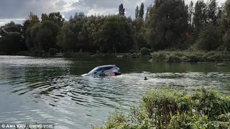 Nhận thấy cụ ông cùng chú chó mắc kẹt trong chiếc ô tô đang dần chìm giữa hồ, 3 người đi đường dũng cảm đã nhảy xuống giải cứu.