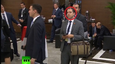 Một đoạn video do kênh Russia Today đăng tải cho thấy trong khi Tổng thống Nga - Mỹ đang hội đàm bên lề hội nghị thượng đỉnh G20 thì một người đàn ông bí ẩn đã đến gần nghe trộm.