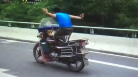 Hình ảnh nam thanh niên đi xe máy, buông cả 2 tay và biểu diễn những động tác múa may được ghi lại trên đường cao tốc của Trung Quốc.