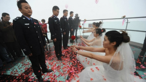 Bốn chàng trai là cảnh sát hình sự tỉnh Tứ Xuyên, Trung Quốc vô cùng bất ngờ và hạnh phúc khi được bạn gái mặc váy cưới, quỳ xuống cầu hôn trước sự chứng kiến của nhiều người trên độ cao hơn một nghìn mét.
