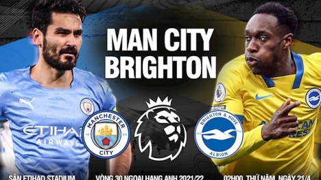 Trực tiếp Man City vs Brighton, link xem trực tiếp Man City vs Brighton: Trận đấu giữa hai đội trong khuôn khổ vòng 30 Ngoại hạng Anh diễn ra vào lúc 02h00 21/04.