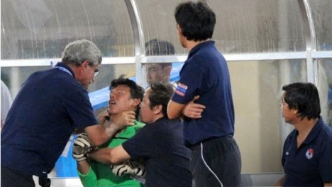 Hình ảnh HLV Calisto 'bóp cổ' Tấn Trường 10 năm trước bất ngờ gây 'bão'