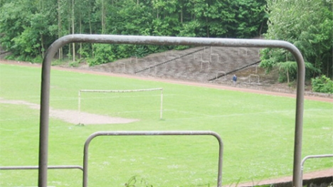 Fan treo cổ trên khung thành sân bóng, bị chó hoang cắn nát