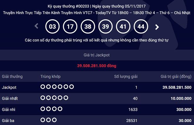 Trong kỳ quay số mở thưởng (QSMT) ngày 5/11/2017, Công ty xổ số điện toán Việt Nam (Vietlott) đã xác định được 01 vé trúng thưởng giải đặc biệt (Jackpot) sản phẩm xổ số Mega 6/45 trị giá lên tới 39.508.281.500 đồng.