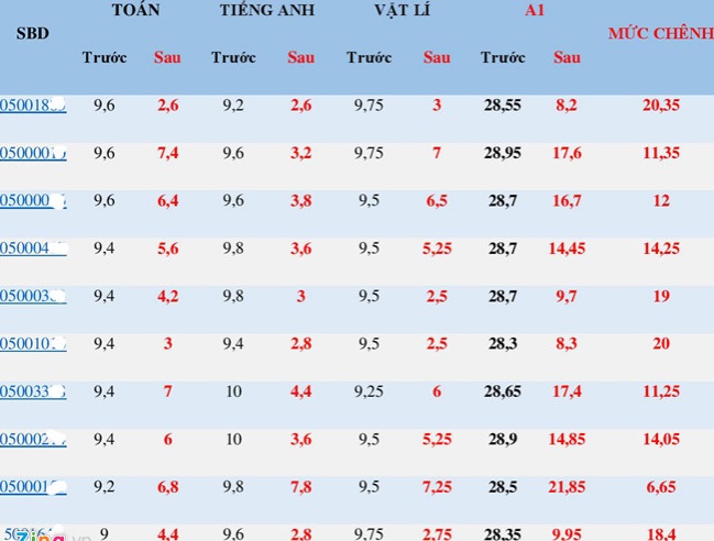 Tất cả 114 thí sinh, với hơn 330 bài thi, có tổng điểm đã công bố chênh lên hơn 1,0 điểm so với điểm chấm thẩm định. Không ít thí sinh có tổng điểm chênh lên hơn 20 điểm so với điểm chấm thẩm định. Có thí sinh có tổng điểm được làm tăng lên đến 26,8 điểm, thậm chí 29,95 điểm so với điểm chấm thẩm định.