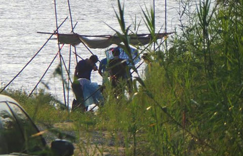 Lực lượng chức năng tiến hành khám nghiệm tử thi tại khu vực bến đò Văn Đức. Ảnh: Zing