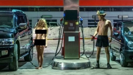 Tại một trạm xăng vùng Siberia, người mẫu Nga Liana Klewtsowa đã cùng một người mẫu nam đứng khỏa thân nhằm phản đối giá xăng liên tục tăng cao.