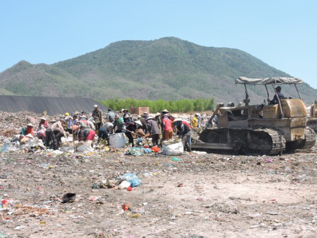 | Người nhặt phế liệu bên trong khu xử lý rác xã Tóc Tiên. Ảnh: Người lao động |