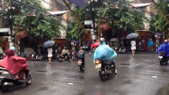 (Tinmoi.vn) Cô gái mặc chiếc váy trắng đứng hàng giờ dưới trời mưa tầm tã ở một đường phố Hà Nội gây sự chú ý của nhiều nguời qua lại.