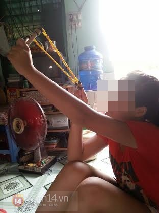Bé C. vô tư chơi với ná thun sau khi xảy ra sự việc.