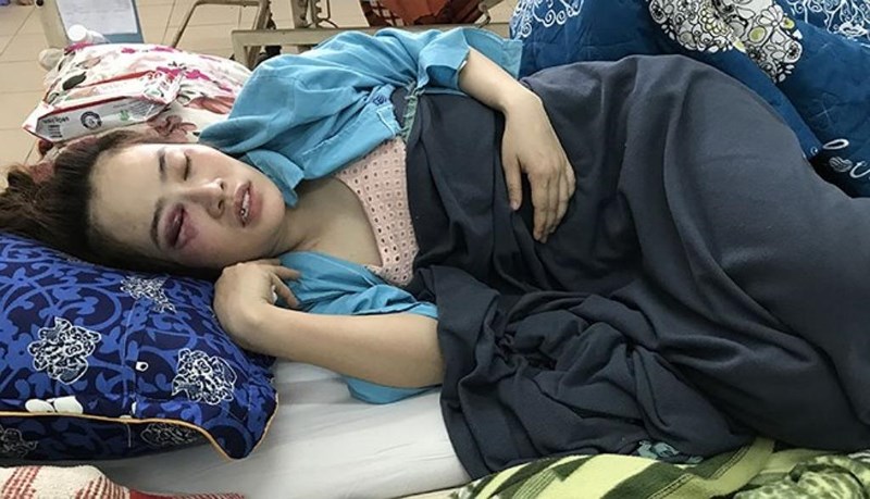 | Chị Như bị đánh gãy mấy cái răng và thâm tím mặt mày. Ảnh PLO |