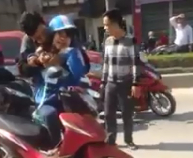 Nữ sinh hoảng loạn khi bị kề dao vào cổ. Ảnh cắt từ clip. |