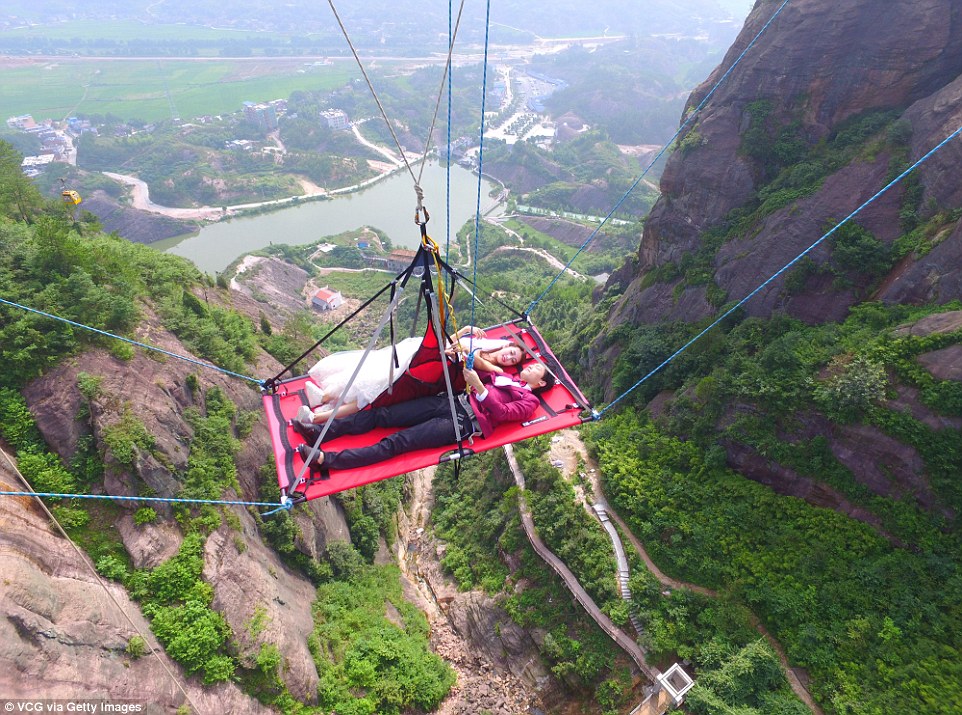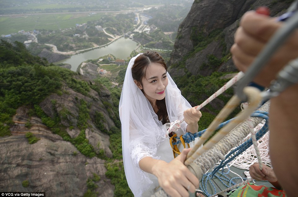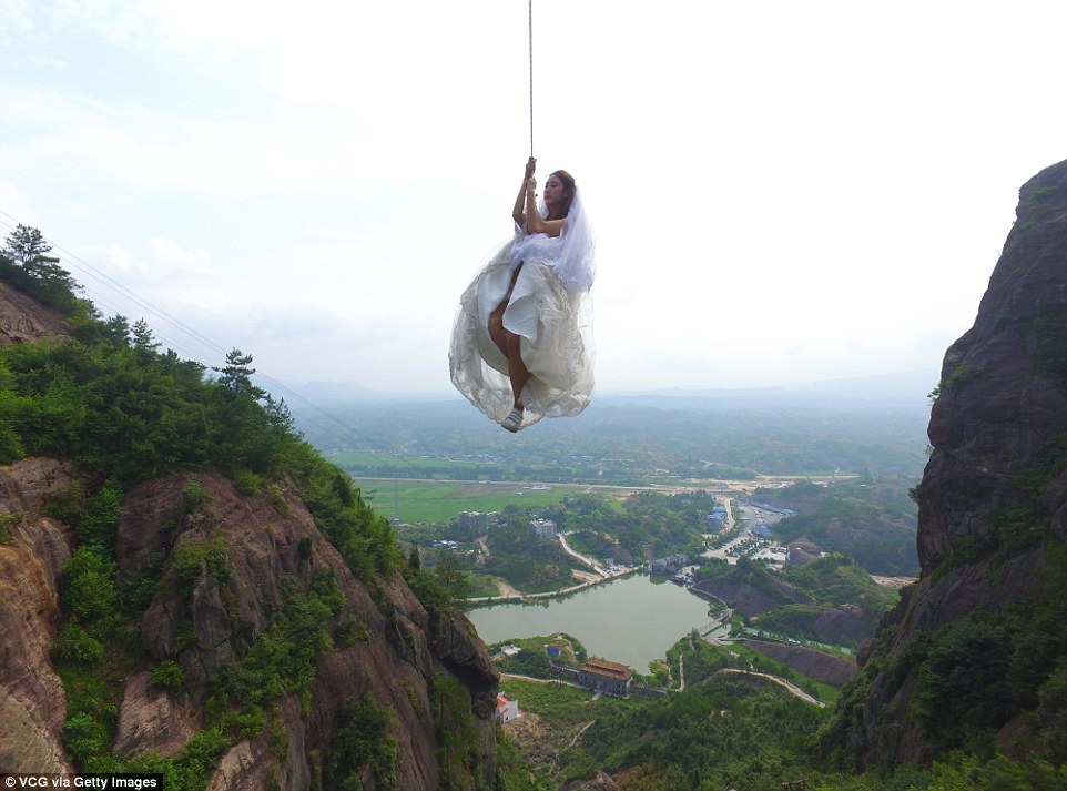 | Cô dâu treo mình ở độ cao cách mặt đất 200m. Ảnh: Daily Mail |