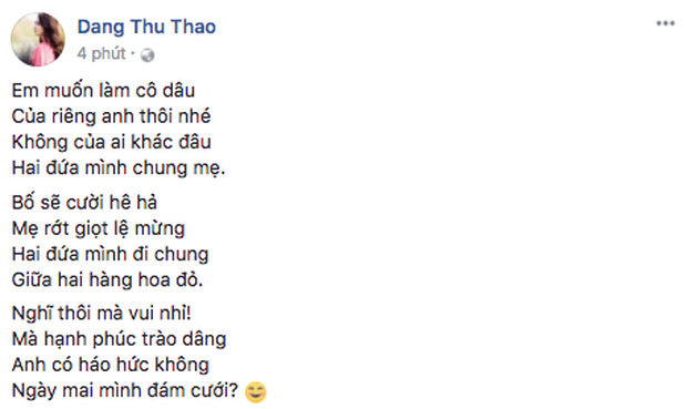 Trên Facebook cá nhân, Hoa hậu Thu Thảo bất ngờ đăng tải hình ảnh hậu trường trong lễ ăn hỏi với doanh nhân Trung Tín diễn ra vào ngày 1/10 vừa qua. Kèm theo đó, người đẹp dành những lời nhắn nhủ vô cùng ngọt ngào tới ông xã: "Em muốn làm cô dâu. Của riêng anh thôi nhé. Không của ai khác đâu. Hai đứa mình chung mẹ. Ba sẽ cười hê hả. Mẹ rớt giọt lệ mừng.Hai đứa mình đi chung. Giữa hai hàng hoa đỏ. Nghĩ thôi mà vui nhỉ! Mà hạnh phúc trào dâng. Anh có háo hức không. Ngày mai mình đám cưới?".
