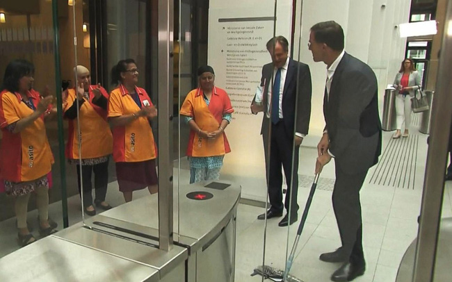 Thay vì bước qua vệt cà phê loang trên sàn, ông Rutte đã nhanh chóng mượn cây chổi từ những người lao công và tự tay dọn dẹp trước sự bất ngờ và nể phục của những người xung quanh.