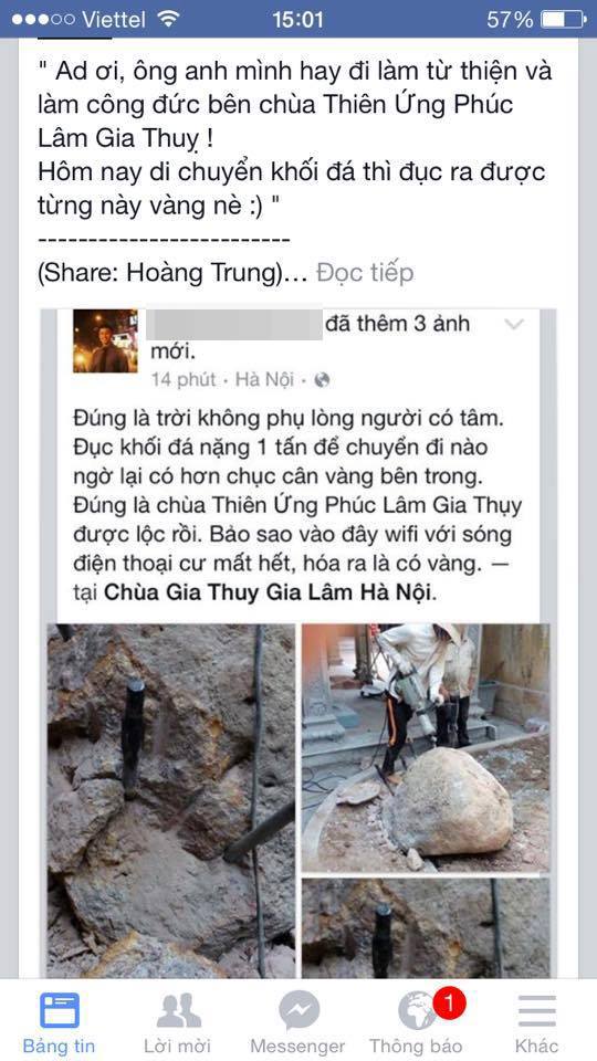 Theo đó, chiều ngày 3/6, trên một số trang mạng xã hội xuất hiện tài khoản Facebook có tên Đ.N.H đã chia sẻ dòng trạng thái:"Đúng là trời không phụ lòng người có tâm. Đục khối đá nặng 1 tấn để chuyển đi nào ngờ lại có hơn chục cân vàng bên trong. Đúng là chùa Thiên Ứng, Phúc Lâm, Gia Thụy được lộc rồi. Bảo sao vào đây wifi với sóng điện thoại cứ mất hết, hóa ra là có vàng", gây xôn xao Cộng đồng mạng.