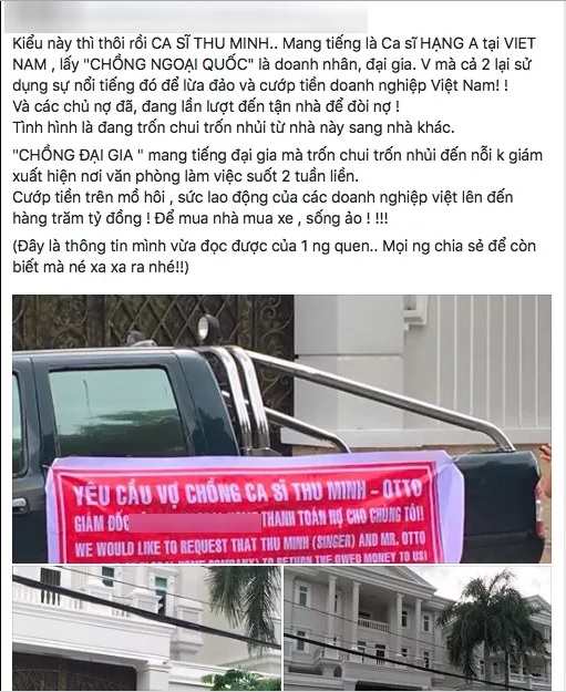 Thu Minh được biết đến là nữ ca sĩ có cuộc sống "bà hoàng" trong showbiz Việt. Tuy nhiên, ngày 28/7, một tài khoản Facebook bất ngờ đăng tải một số hình ảnh và status tố Thu Minh lừa đảo và cướp tiền doanh nghiệp để mua xe, mua nhà "sống ảo". Theo người này chia sẻ, vợ chồng Thu Minh lợi dụng danh tiếng của mình để lừa gạt tiền của doanh nghiệp khiến các chủ nợ sang tận nhà để đòi lại. Ngoài ra, tài khoản này còn viết thêm, 2 ngày qua, Thu Minh phải "trốn chui trốn nhũi" từ nhà này sang nhà khác để trốn nợ.