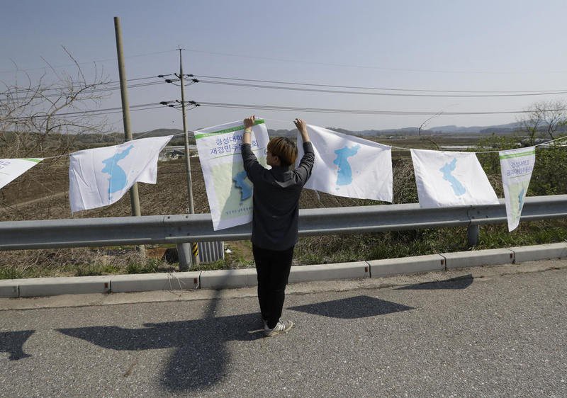 Một người đàn ông treo lá cờ thống nhất trên cây cầu Thống nhất dẫn tới Bàn Môn Điếm, nơi hai nhà lãnh đạo Triều Tiên và Hàn Quốc sẽ gặp nhau vào ngày mai. Ảnh: AP