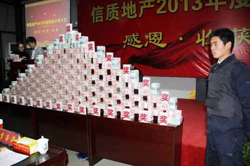Tổng số tiền thưởng lên đến 11 triệu NDT (tương đương hơn 38 tỷ đồng) có nhân viên được thưởng đến gần 2 triệu NDT (7 tỷ đồng). Toàn bộ số tiền này được xếp thành một bức tường cao trên sân khấu để thủ quỹ chia cho các nhân viên.