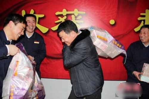 Một công ty bất động sản ở tỉnh Hà Nam (Trung Quốc) chia tiền thưởng Tết cho toàn bộ nhân viên nhiều tới mức họ phải mang bao tải đến để đựng.