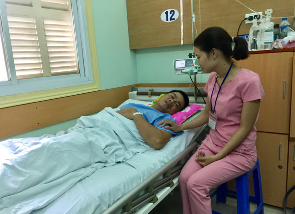 Sau vụ tai nạn, Thượng úy Đức vẫn còn rất yếu, anh đang được vợ chăm sóc tại BV Việt Đức. Ảnh: Báo Giao thông |
