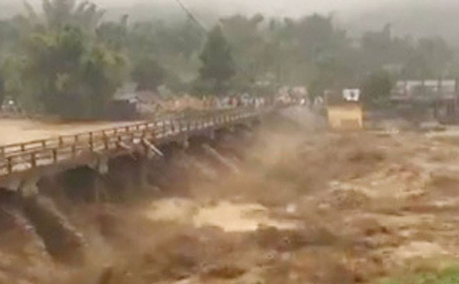 Lượng mưa lớn khiến nước trên sông chảy qua khu vực cầu Nung, thị xã Nghĩa Lộ, Yên Bái dâng cao đe dọa trực tiếp đến đời sống của người dân.