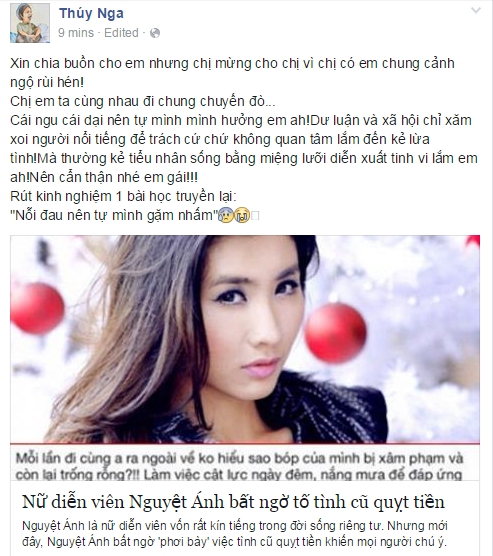 Thúy Nga viết: “Xin chia buồn cho em nhưng chị mừng cho chị vì chị có em chung cảnh ngộ rùi hén! Chị em ta cùng nhau đi chung chuyến đò. Cái ngu cái dại nên tự mình mình hưởng em à! Dư luận và xã hội chỉ xăm xoi người nổi tiếng để trách cứ chứ không quan tâm lắm đến kẻ lừa tình! Mà thường kẻ tiểu nhân sống bằng miệng lưỡi diễn xuất tinh vi lắm em à! Nên cẩn thận nhé em gái! Rút kinh nghiệm 1 bài học truyền lại. Nỗi đau nên tự mình gặm nhấm.”