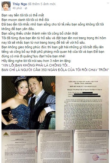 Thúy Nga cũng chính là người đăng đàn trên mạng xã hội, tố cáo chồng cũ là ông Nguyễn Văn Nam đã mượn danh cô để dễ dàng vay tiền người thân trong gia đình, bạn bè. Và rồi, cuối cùng cô cho biết rằng cả ông và tiền đã “một đi không trở lại”. Đến nay vụ việc đã dần lắng xuống.