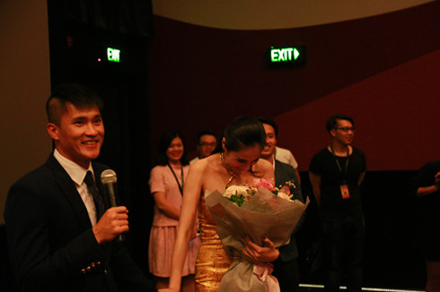 Tuy nhiên, đến phút chót, Công Vinh bất ngờ xuất hiện. Anh đi từ cánh gà của rạp chiếu, tiến tới tặng hoa cho bà xã khiến cô vô cùng xúc động và không giấu được sự ngỡ ngàng.