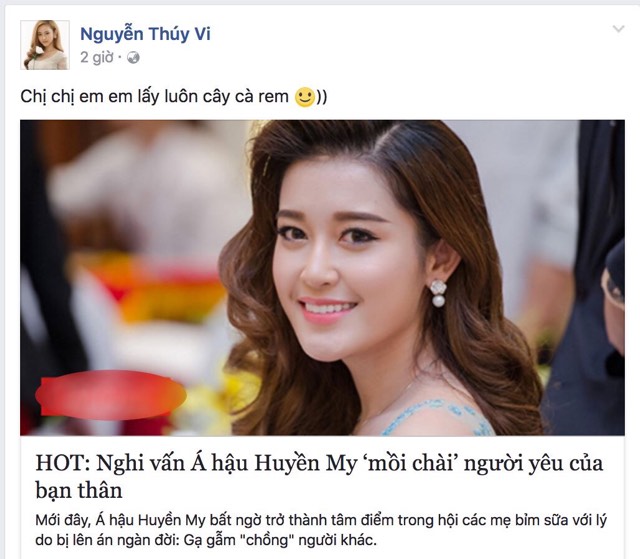 Thúy Vi đã chia sẻ lại link bài viết trên một báo mạng có tựa đề: "Nghi vấn Á hậu Huyền My 'mồi chài' người yêu của bạn thân" trên Facebook cá nhân. Bài đăng của Thúy Vi đi kèm một câu nói có hàm ý mỉa mai đàn chị: "Chị chị em em lấy luôn cây cà rem", kết thúc câu nói là icon cười hết ga.
