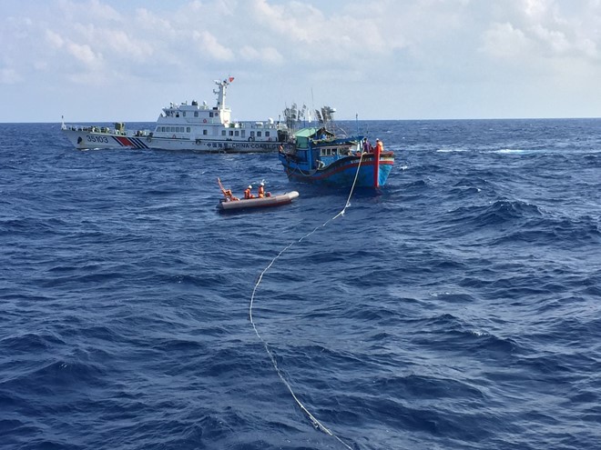 Tại đây, 2 tàu hải cảnh Trung Quốc đã tiến sát, chạy vòng quanh liên tục, dùng loa phóng thanh yêu cầu tàu cá ngư dân Khánh Hòa không được neo đậu.