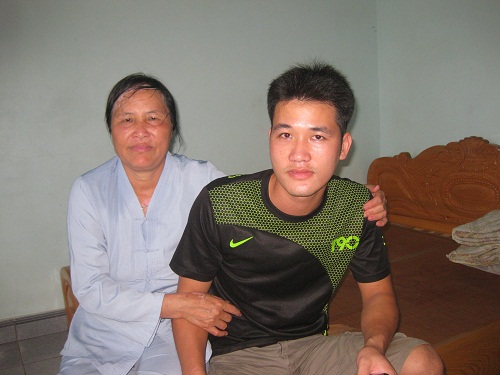 Bà Thơm cùng con trai Hoàng Văn Nam ( SN 1991). Nam cho biết mình cũng có hai cặp núi đôi như mẹ.