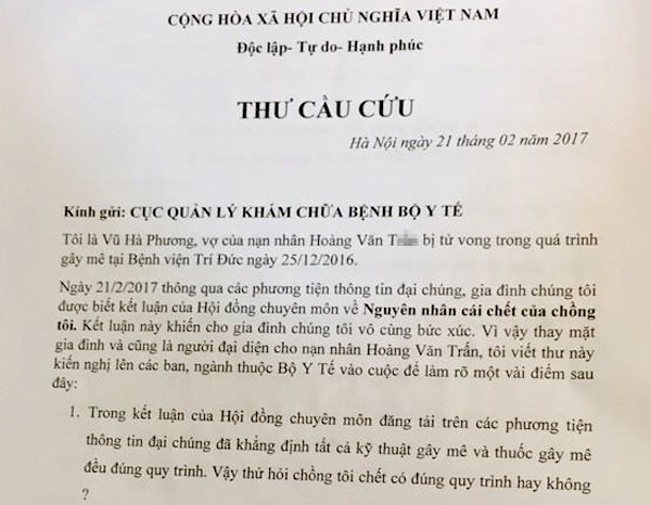 Liên quan đến sự việc hai bệnh nhân tử vong bất thường sau gây mê tại BV Trí Đức, vợ của nạn nhân Hoàng Văn T. là chị Vũ Hà Phương (Phú Xuyên, Hà Nội) chia sẻ trên Vietnamnet cho biết ngày 21/2, chị đã gửi thư cầu cứu đến Bộ trưởng Y tế Nguyễn Thị Kim Tiến, Cục Quản lý khám chữa bệnh và Thanh tra Bộ Y tế.