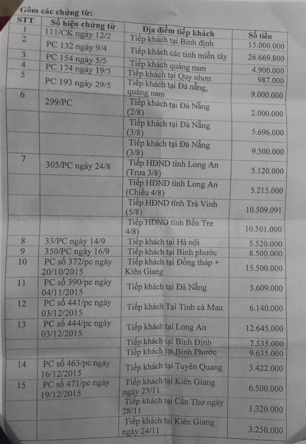 Đơn cử như ngày 25/11/2015, chi tiết tiếp khách Cà Mau 17,8 triệu đồng, không hóa đơn; Tiếp khách Bình Định 15 triệu đồng; Long An 12,6 triệu đồng...