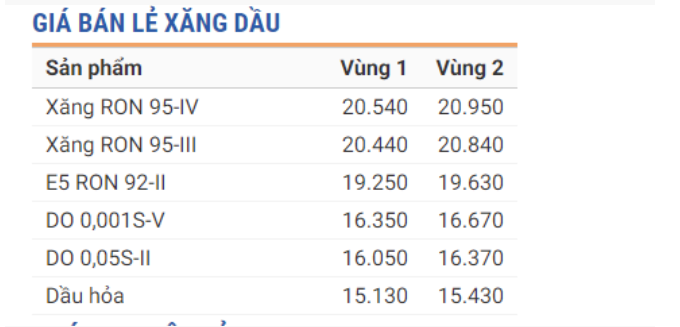 Giá bán lẻ xăng dầu vùng 1 (bao gồm các tỉnh thành phố là Hà Nội, Hải Phòng, Quảng Ninh, Đà Nẵng, TP HCM...)