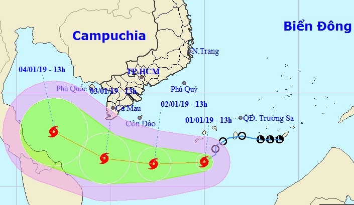 Chiều 1/1, áp thấp nhiệt đới trên vùng biển Tây Nam quần đảo Trường Sa đã mạnh lên thành bão, trở thành cơn bão số 1 năm 2019, có tên quốc tế là Pabuk . Hồi 16h ngày 1/1, vị trí tâm bão ở vào khoảng 6,2 độ Vĩ Bắc; 109,7 độ Kinh Đông, cách đất liền các tỉnh Nam Bộ khoảng 500km về phía Đông Nam, cách Côn Đảo khoảng 430km về phía Đông Nam. Sức gió mạnh nhất vùng gần tâm bão mạnh cấp 8 (60-75km/giờ), giật cấp 10.