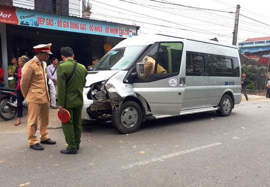 Hiện trường vụ tai nạn khiến 1 người đàn ông tử vong khi xe máy tông xe 16 chỗ. Ảnh: Người lao động |