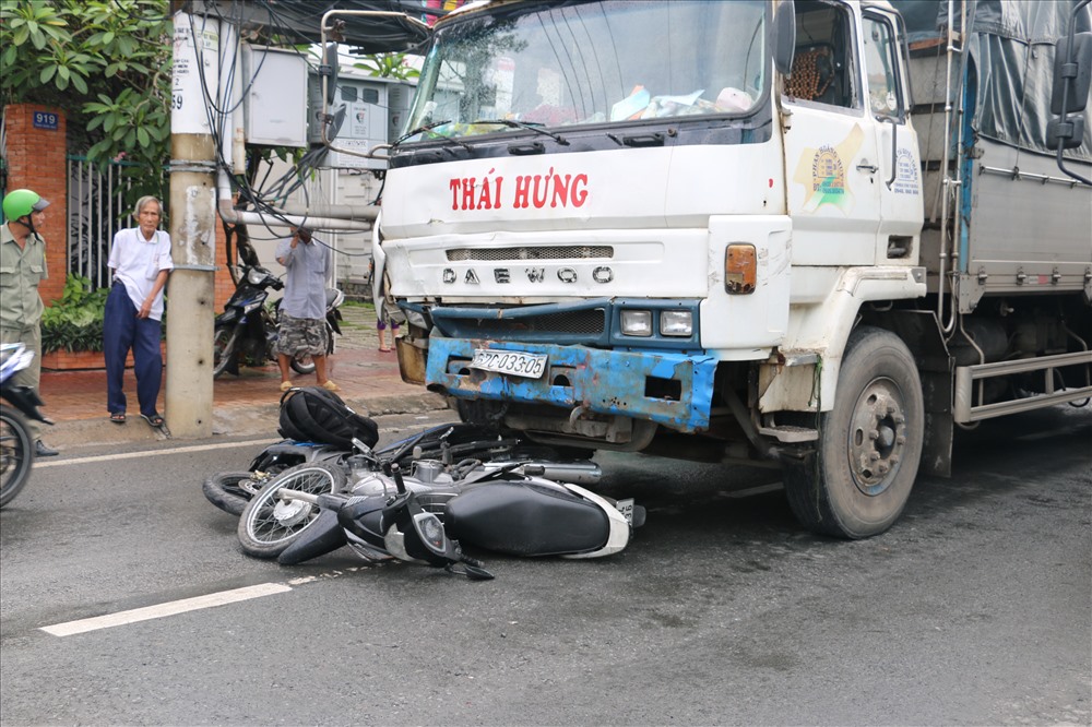 Sau đó, chiếc xe tải điên này tiếp tục lao đi hơn 500m đến khu vực quốc lộ 91 giao nhau với đường Hàm Nghi (cũng thuộc phường Bình Khánh) tông vào 2 xe máy đi cùng chiều, làm 2 xe này bị mắc kẹt dưới gầm xe tải.
