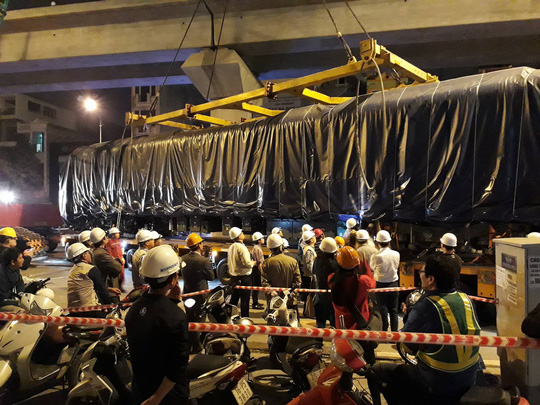 Việc cẩu các toa tàu lên cầu cạn được thực hiện bằng cẩu bánh xích loại 250 tấn. Mỗi đầu kéo và toa tàu có thời gian thi công lắp đặt từ 1,5 đến 2 tiếng đồng hồ.