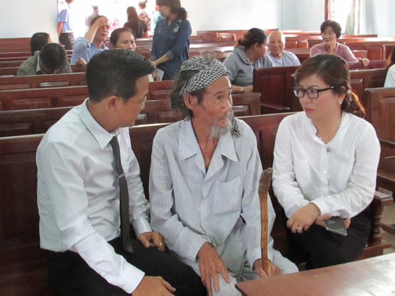 Luật sư động viên ông cụ 84 tuổi trong lúc chờ tòa nghị án. Ảnh: Báo Pháp luật TP HCM |