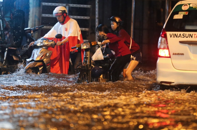 Mưa ngập khiến hàng loạt xe chết máy. Ảnh: VNE |