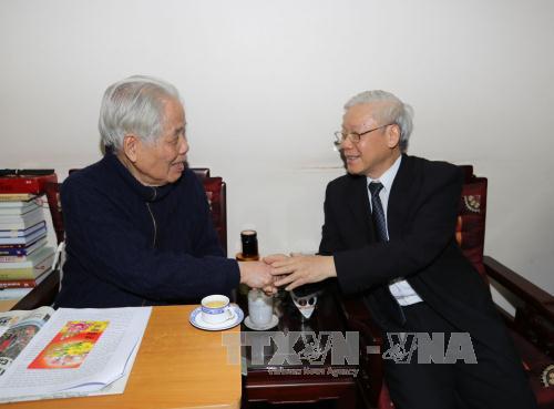 | Tổng Bí thư Nguyễn Phú Trọng chúc thọ nguyên Tổng Bí thư Đỗ Mười (Ảnh: TTXVN) |