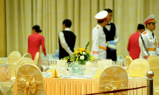 Khoảng hơn 20h, Chủ tịch nước và Tổng thống Mỹ bước vào phòng tiệc trong tiếng nhạc và tiếng vỗ tay. Các bàn tiệc được thắp nến, mỗi bàn được đặt tên theo một loại hoa, thông tin trên VnExpress.