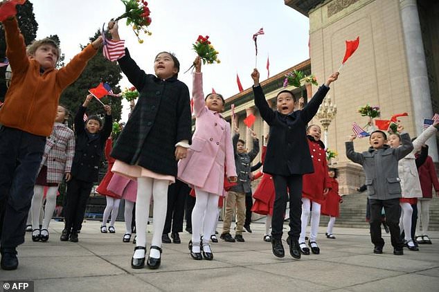 | Tổng thống Trump tươi cười với trẻ em Trung Quốc. Ảnh: AFP |
