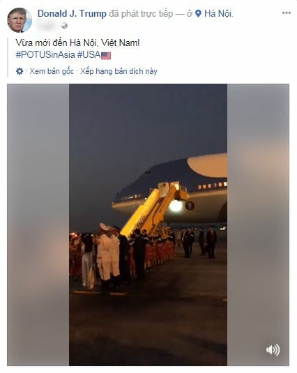 Tổng thống Donald Trump đã phát trực tiếp trên Facebook ngay khi đặt chân xuống sân bay Nội Bài, bắt đầu thăm cấp nhà nước tại Hà Nội.