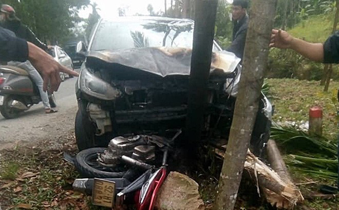Cú tông trực diện khiến 2 người đi xe máy bị thương nặng và được đưa đi cấp cứu. Tại hiện trường, xe máy bị cháy trơ khung, ô tô bị cháy phần đầu.